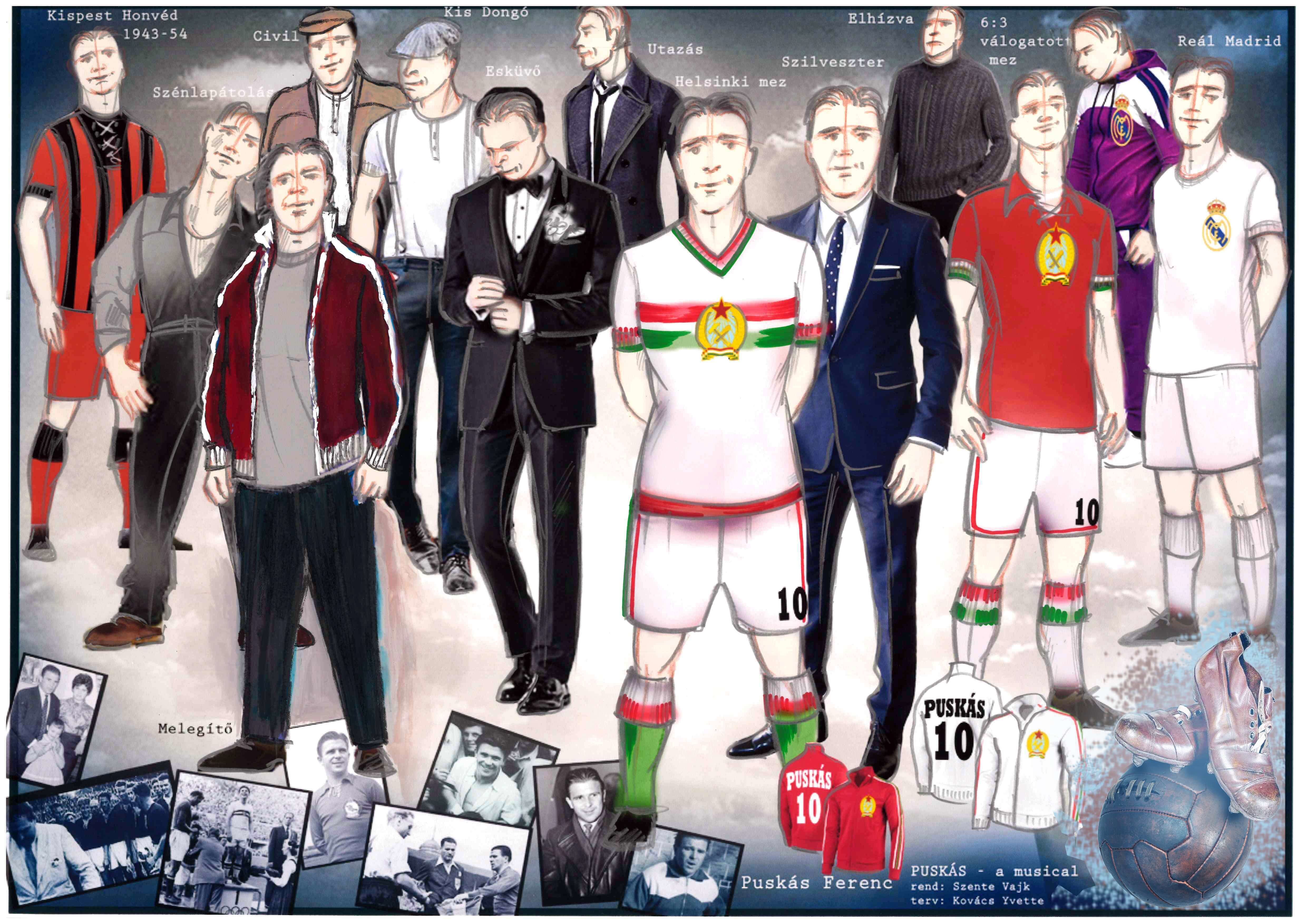 A Puskás Ferencről és az Aranycsapatról szóló musical szereplőinek jelmeztervezése többszörösen kreatív feladat volt. A kor divatjának megjelenítése (1930-1950-es évek), mégis a formák, szabások és anyagok mai átértékelése jelentette a főbb irányvonalat. Az előadásban felvonuló közel százfős szereplőgárda mindegyike többször öltözik, ezért a jelmezek mennyisége önmagában hatalmas munkát igényelt. A színészek két személy kivételével létező személyt jelenítenek meg, a szereplők tehát valós személyek, akik külön szokásokat, ízlést és öltözeteket tudnak maguk mögött. A fennmaradt képi anyagokat is tanulmányozva alkottuk meg a terveket, hogy az egykori személyiségekhez illően, a finom részleteket is figyelembe véve a nézők felismerjék a karaktereket. A darab elengedhetetlen része, hogy jellegzetes öltözékük alapján felismerjék és megismerjék az akkori ruházatuk alapján az Aranycsapat, a külföldi csapatok tagjait, a politikusokat, az akkori rendszer és hatalom kiszolgálóit. A darabban felvonultatott mezek tervezése, és korhű mégis modern megjelenítése az egyik legizgalmasabb időutazás, alapjául az adott csapatok szín- és motívumvilága szolgált, a minőség és a forma viszont a mai sztárfutballisták öltözeteit idézi.